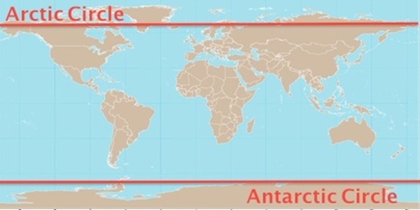 Chasing the lights can take you in either direction; North or South. The auroras are the visible effect of solar winds hitting the Earth’s magnetic field, deflecting towards the magnetic poles and then burning in our atmosphere. The majority of activity is close to the poles, in the Arctic Circle and the Antarctic Circle (highlighted below):